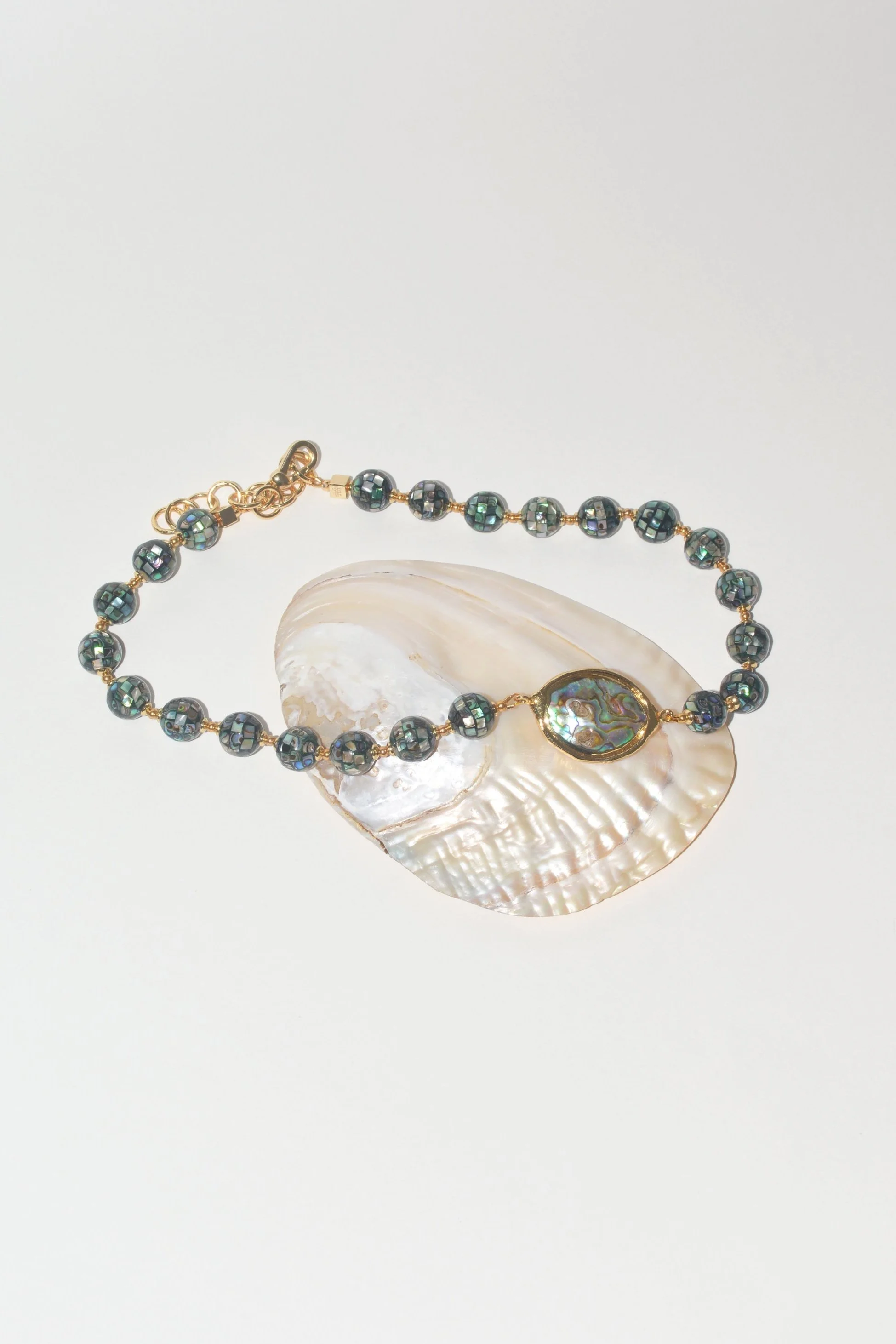 Abalone shell is a shimmering, iridescent material sourced as a sustainable by‑product, transforming what might be discarded, into wearable art. Its natural glow reveals a palette of green, blue, pink, with metallic hues that shift with every angle to ensure no two pieces are ever identical.