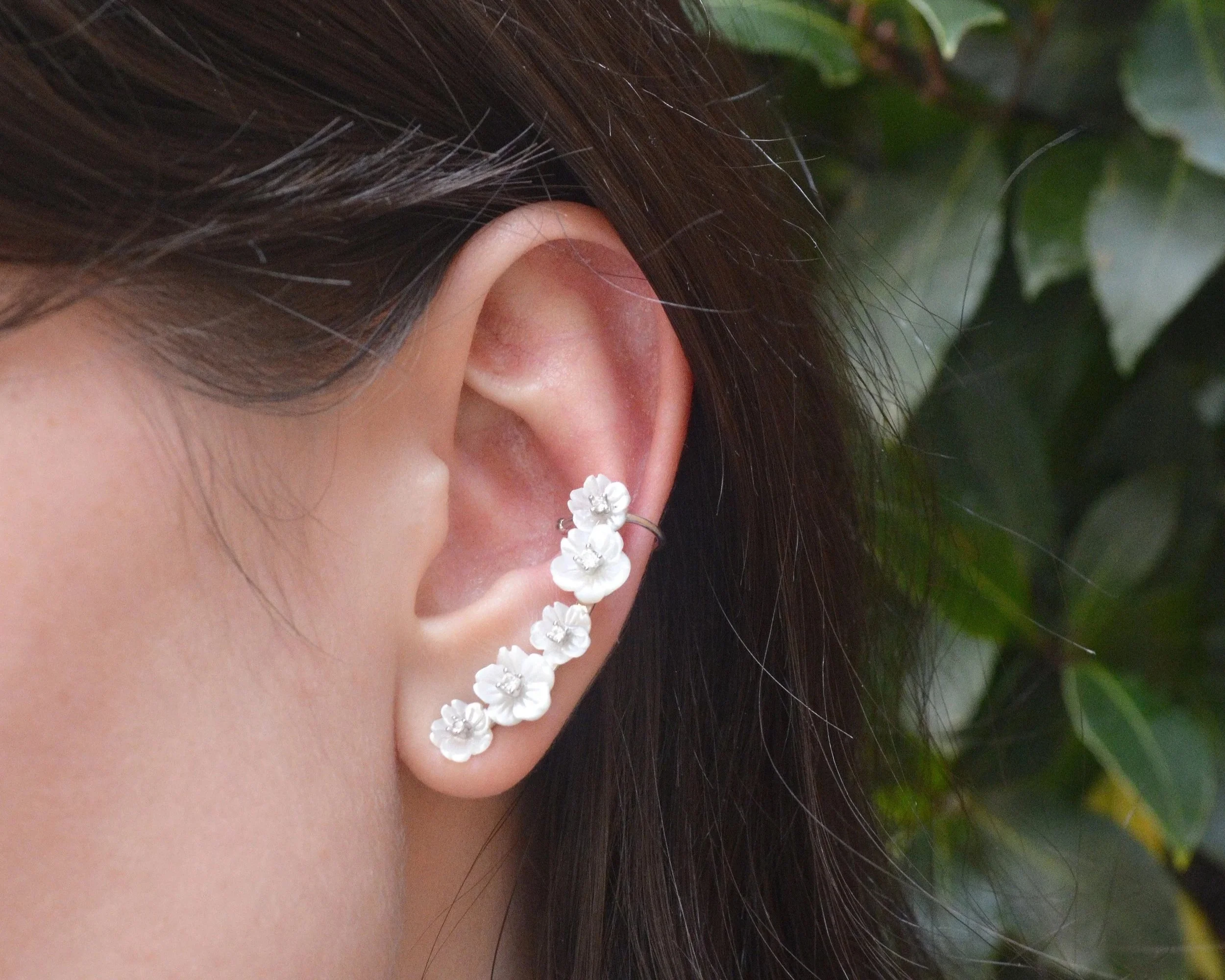 At the heart of the look are delicate ear crawlers that unfurl like flowers in bloom, embracing the curve of the ear in a soft, organic silhouette. Styled together, they create the illusion of petals blossoming across the ear, intricate yet effortless.